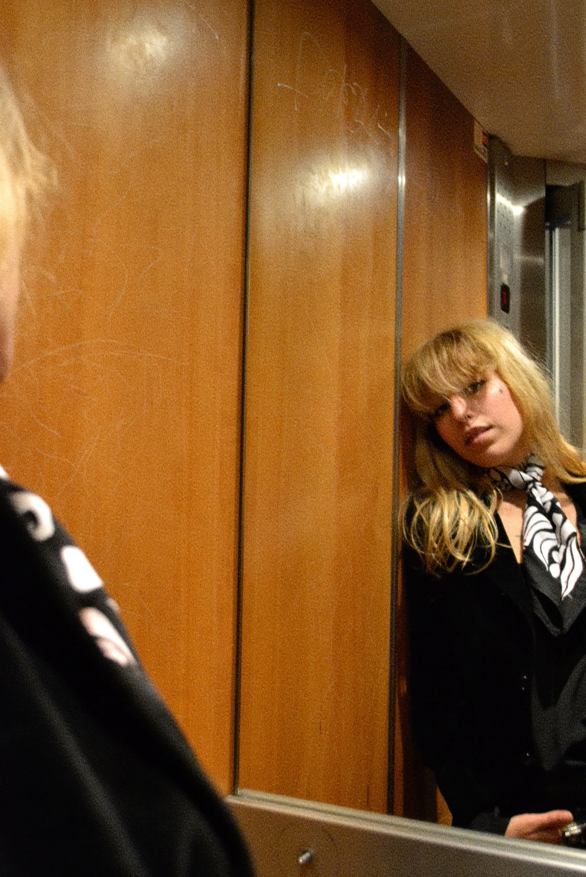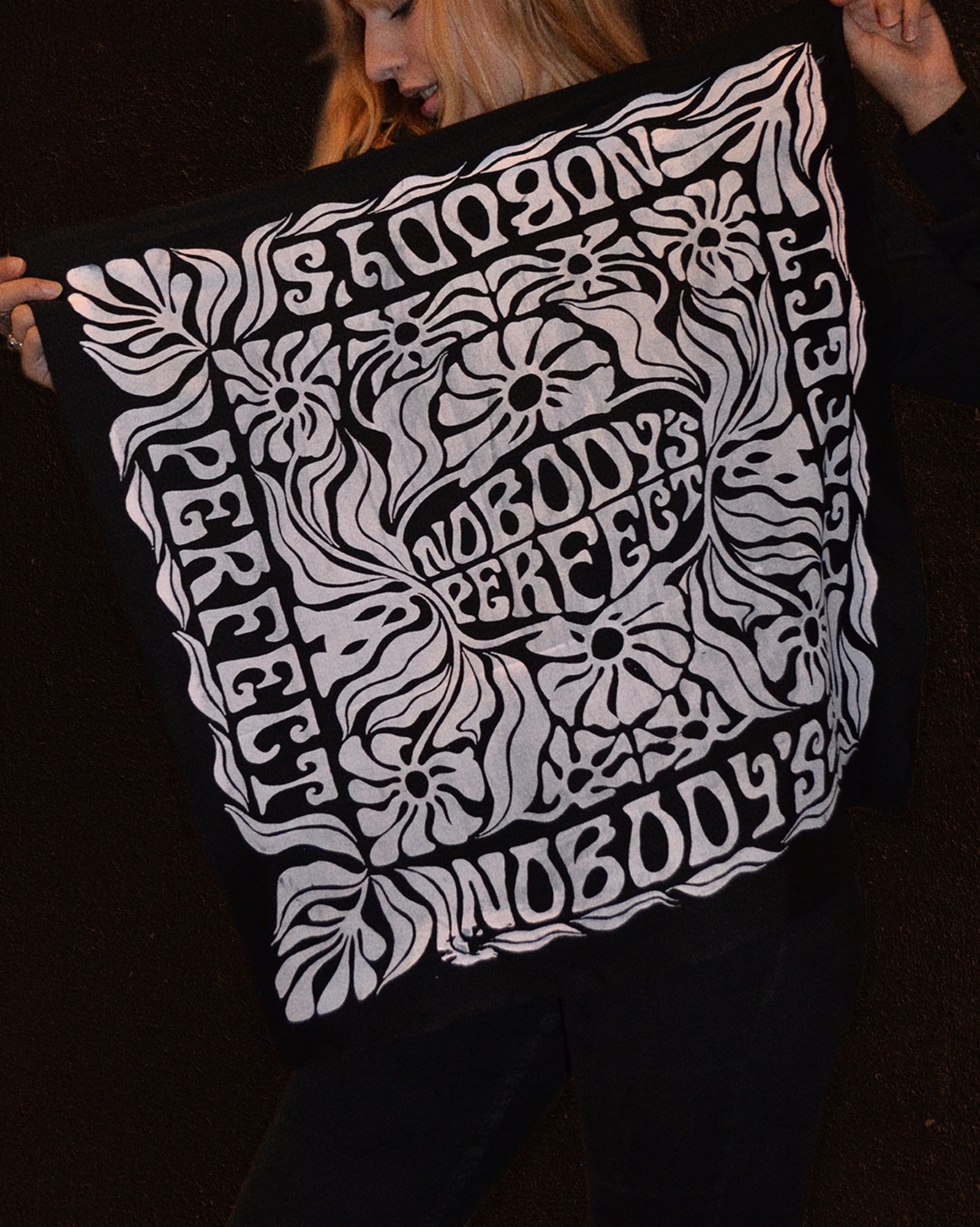 The "NOBODY'S PERFECT" black silk scarf is 100% silk, silkscreened by Lisa Marie Järlborn in the Paris atelier, after an original illustration and with a handmade screen.