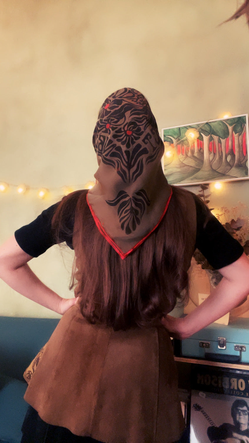 Dark brown & bright orange red print.